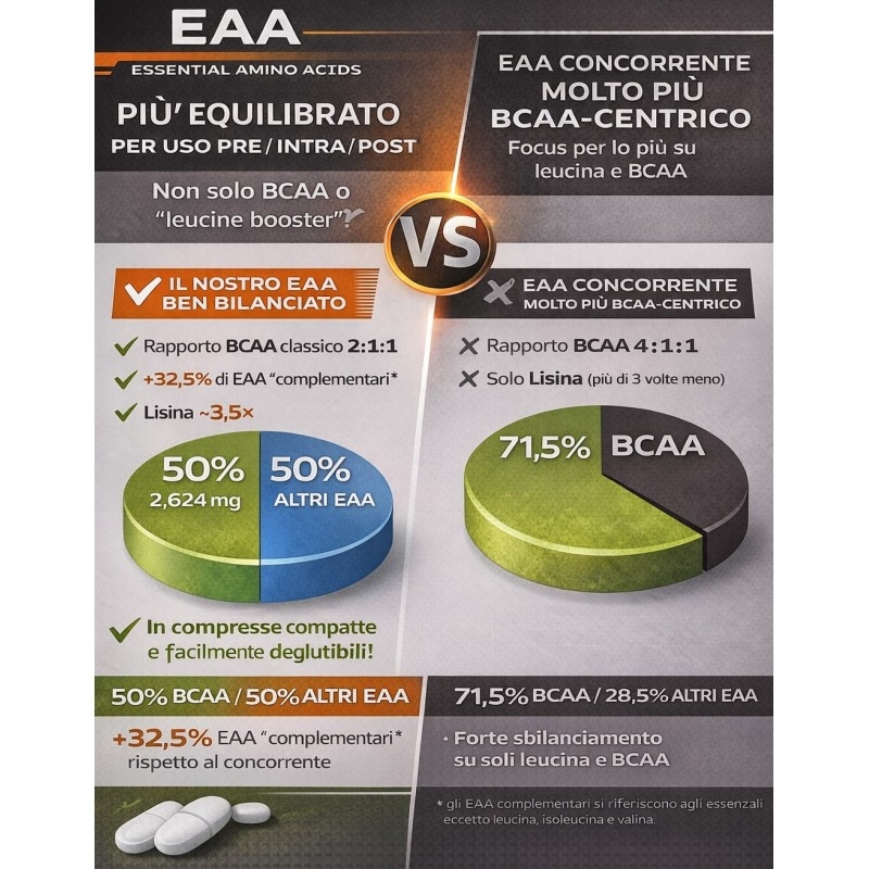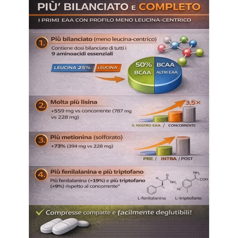 A differenza delle formule leucina-centriche, questo prodotto offre maggiore spazio agli EAA complementari, con particolare attenzione a lisina, metionina, fenilalanina e triptofano, per una composizione più completa.