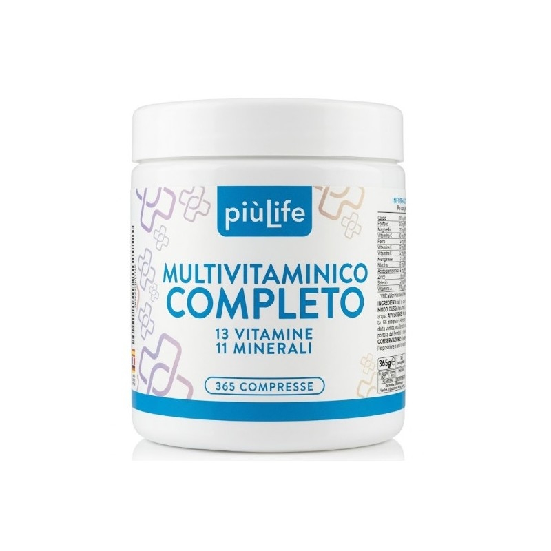 Piùlife Multivitaminico Completo è un integratore alimentare multivitaminico e multiminerale bilanciato per il benessere quotidiano. La sua formulazione include 13 vitamine e 11 minerali essenziali per supportare il metabolismo energetico e il sistema immunitario.